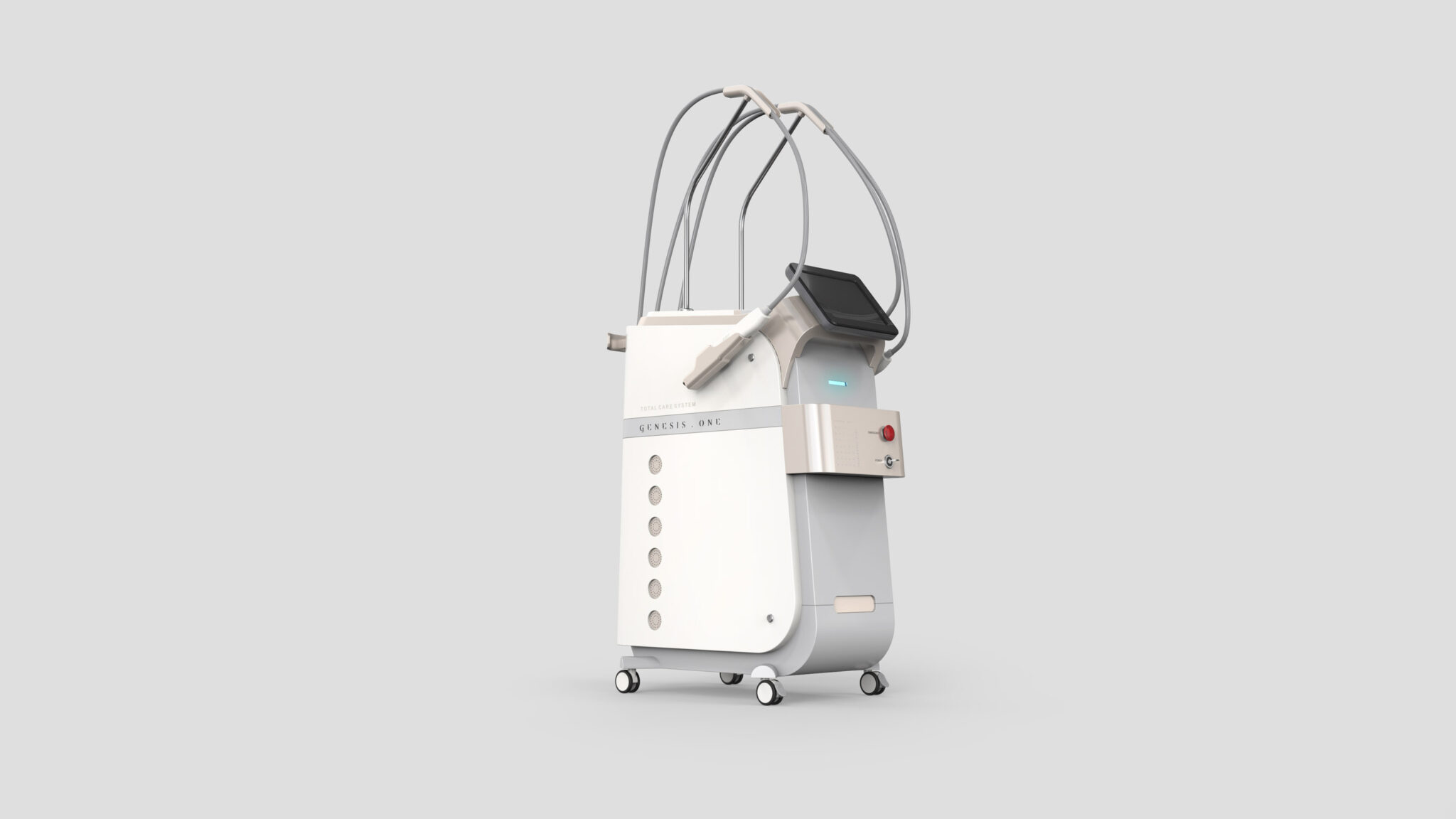 본체는 곡선과 직선을 절제된 비율로 조합한 조형 구조를 통해 견고함과 친화적 인상을 동시에 전달하며, 전면 패널의 라운드 엣지는 장비의 덩어리감을 완화시켜 환자와 시술자 모두에게 심리적 부담을 줄이는 역할을 한다.