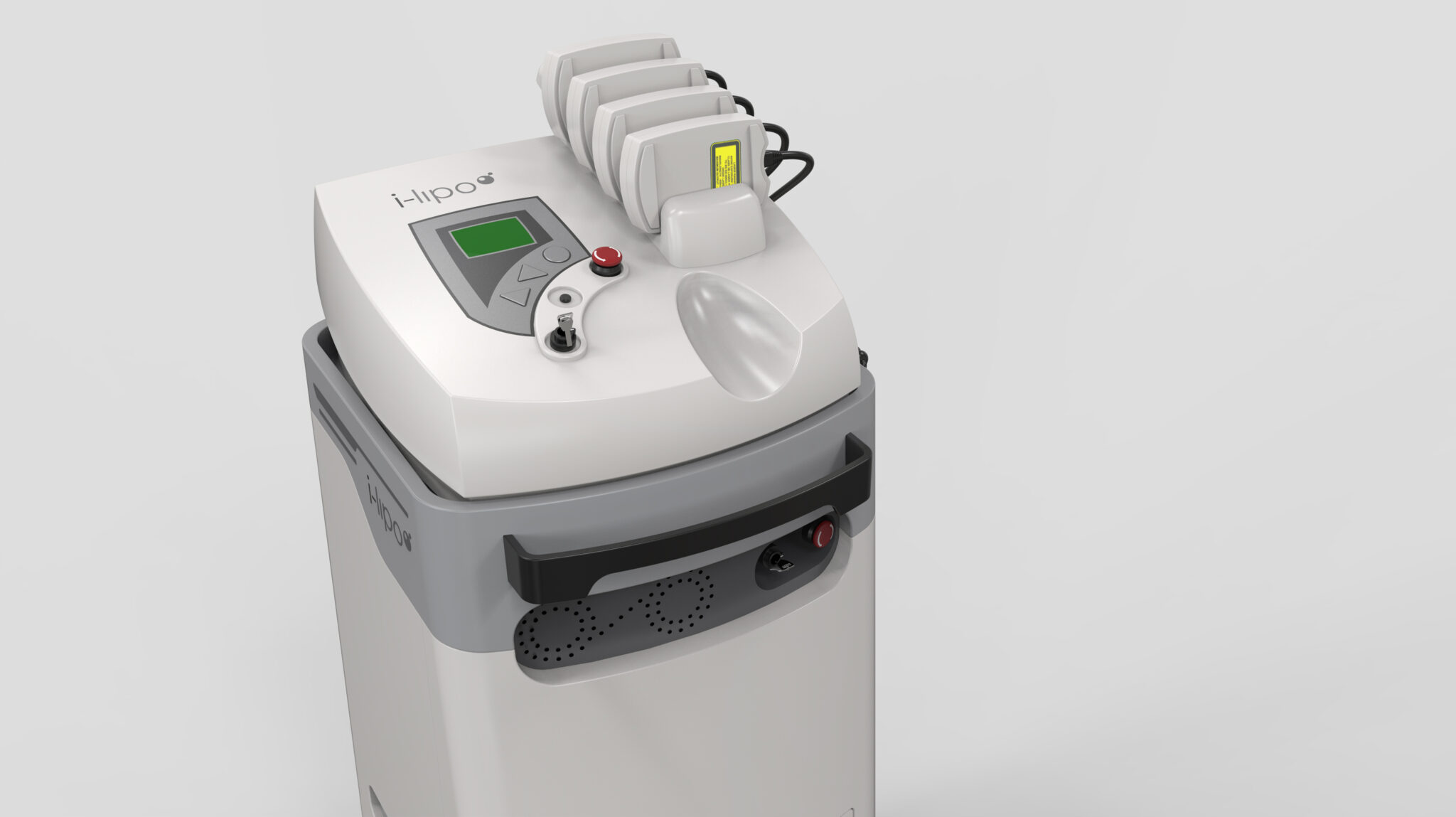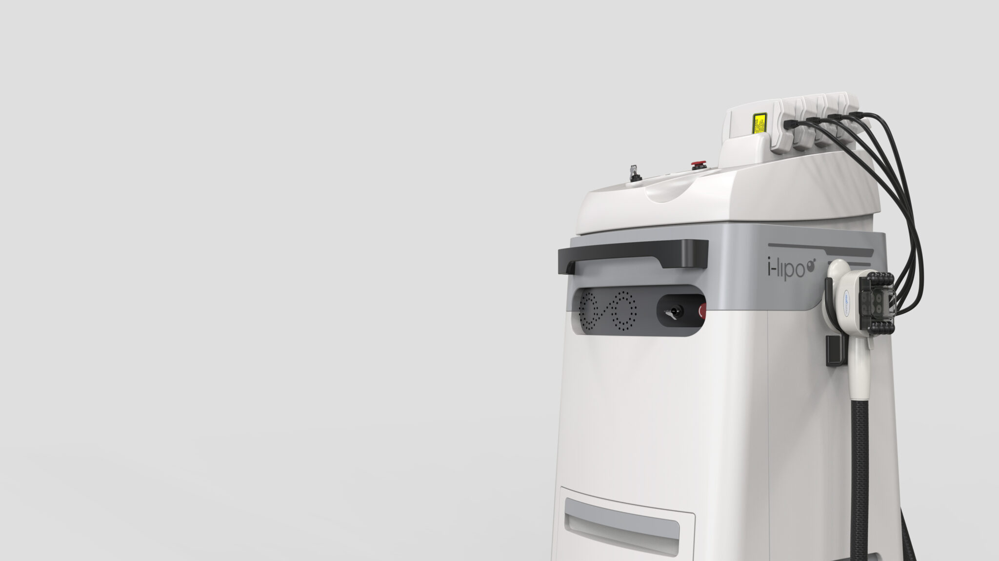 상단 모듈은 다양한 핸드피스/프로브를 수납·정리하는 구조로 설계되어 작업 동선 최소화, 표준화된 사용 패턴을 제공하고, 중앙부의 콘솔·에어 벤트·인터페이스 라인은 의료기기 특유의 기능적 요소를 시각적으로 정돈된 형태로 재배열해 클린하고 직관적인 프로페셔널 레이아웃을 형성한다. 하단의 베이스와 캐스터는 안정적 무게 중심을 유지하면서 의료공간 내 이동성과 실사용성을 높여 “움직이는 의료 워크스테이션”으로서의 정체성을 강화한다.