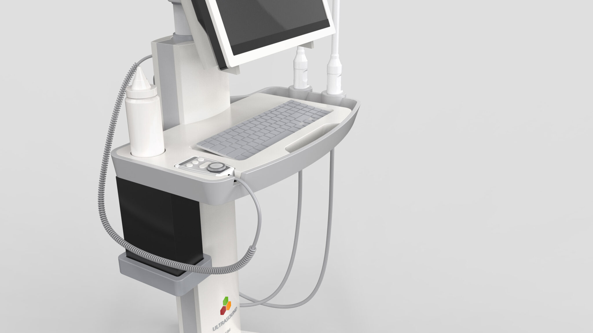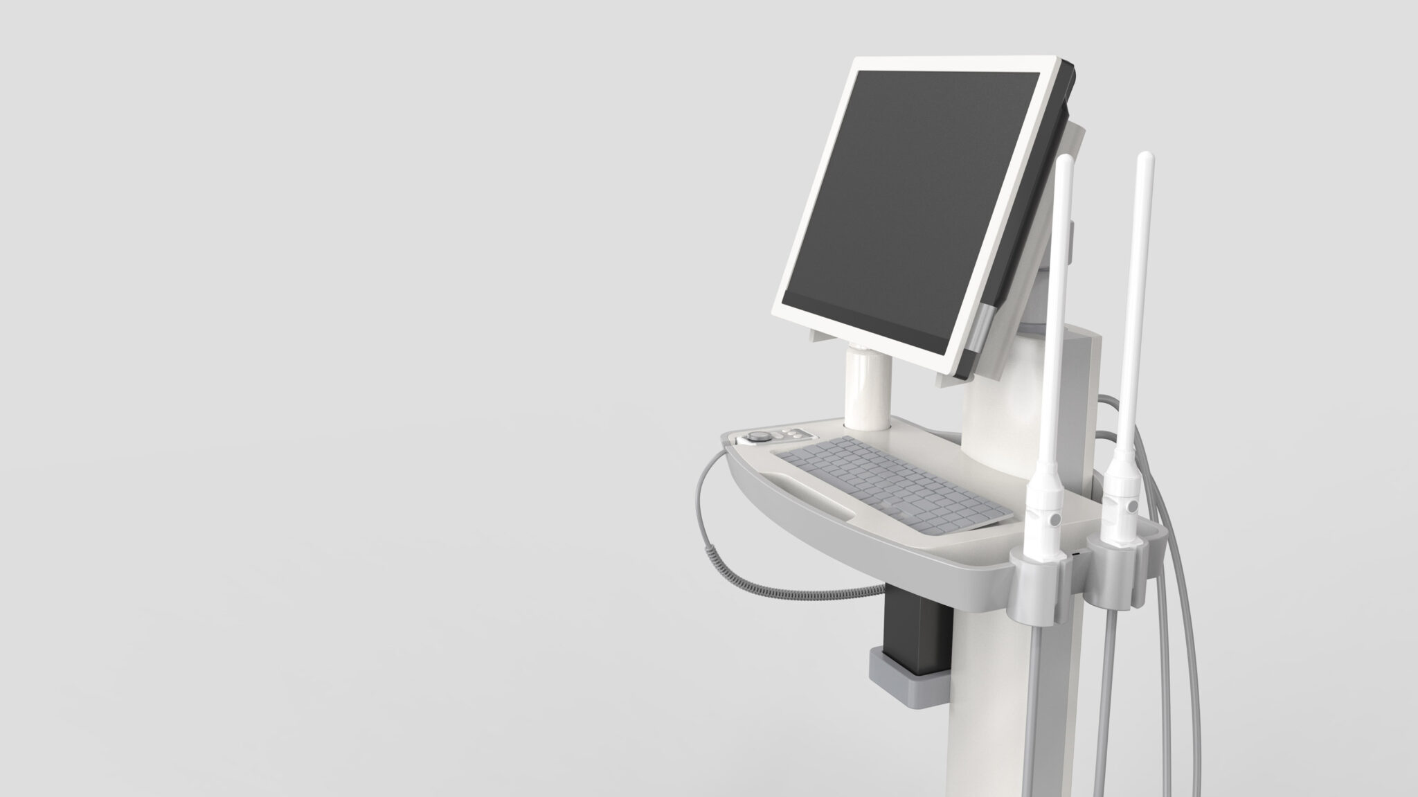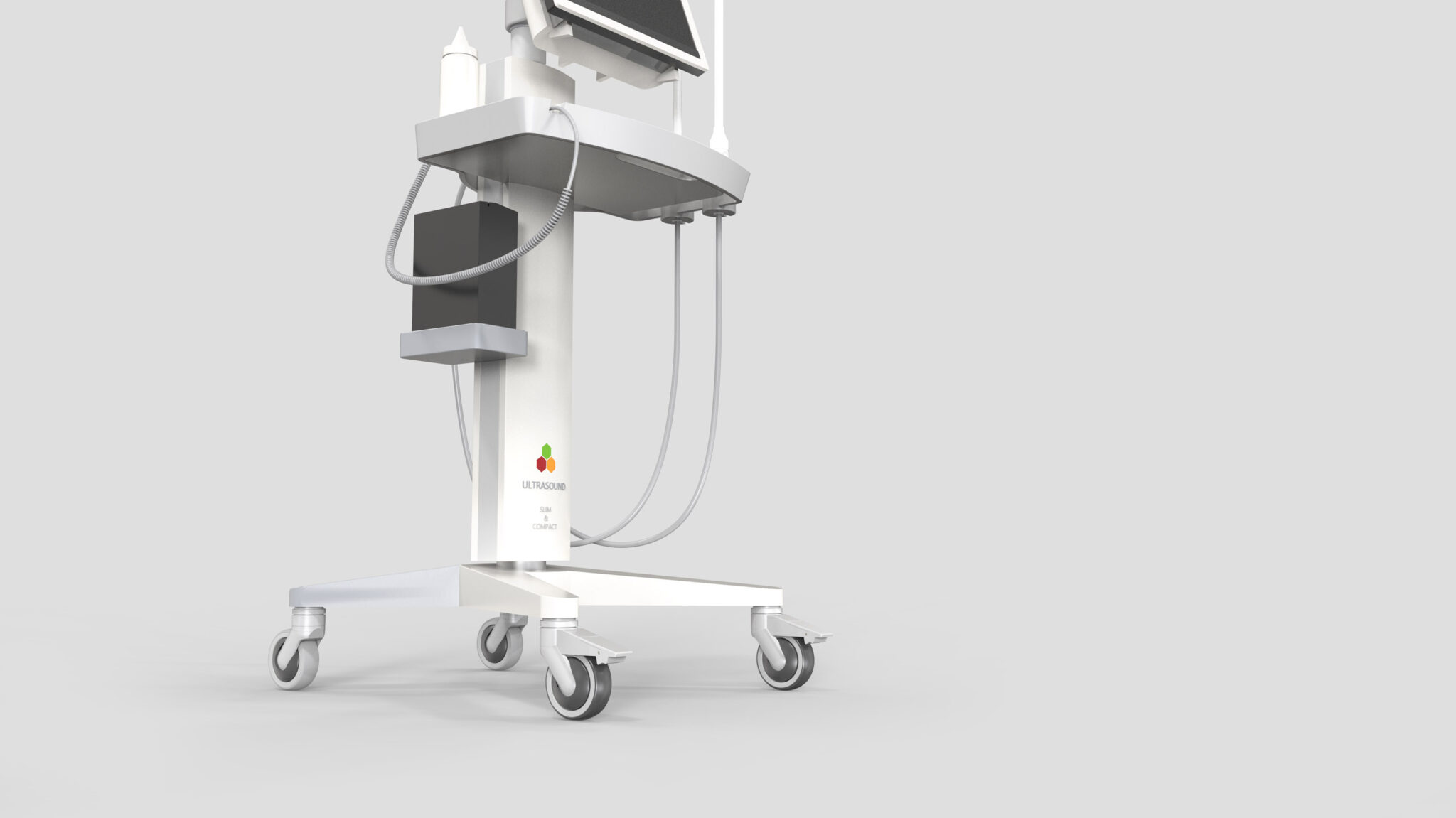 세로형 메인 포스트는 다양한 모듈(디스플레이, 트레이, 프로브 홀더, 액세서리 박스)을 안정적으로 지지하는 Lightweight Structure로 설계되었다. 프로브 케이블이 자연스럽게 흐르면서 꼬임이나 걸림을 예방하도록 라우팅 경로를 명확히 설정해 Ergonomic Workflow를 완성했다. 상단 디스플레이는 틸팅 및 회전이 용이한 힌지 구조를 적용하여 다양한 작업 자세와 시야각을 지원한다. 이는 의료진이 좁은 검사실이나 침대 주변에서도 빠르고 정확하게 위치를 조정할 수 있는 Instrumental Precision UX를 반영한 결과다.