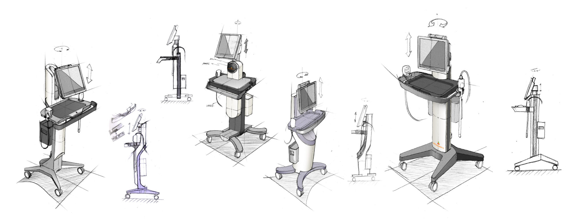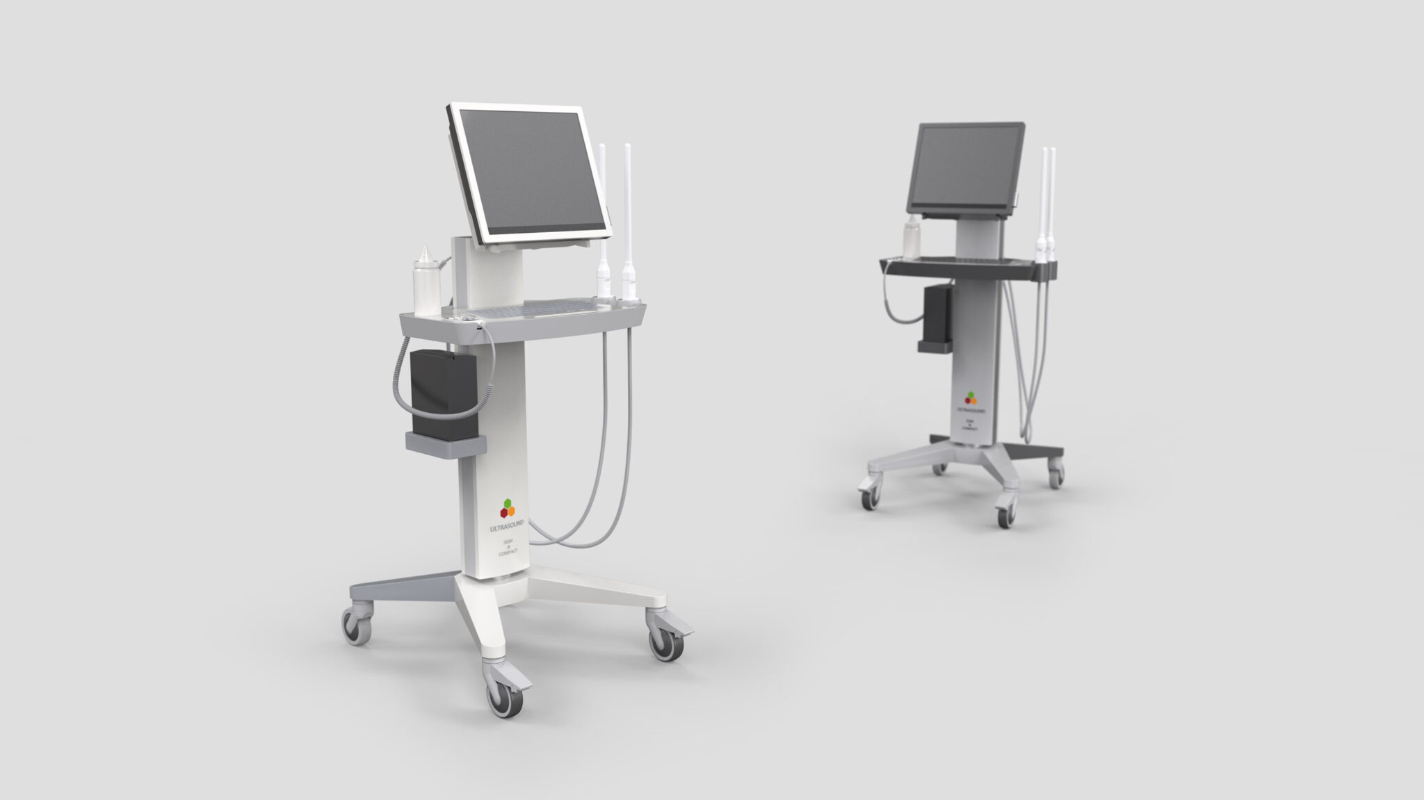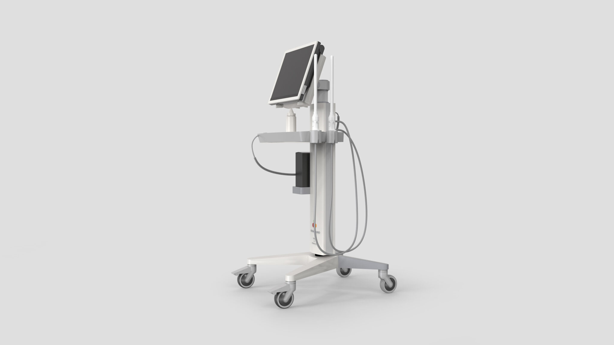 세로형 메인 포스트는 다양한 모듈(디스플레이, 트레이, 프로브 홀더, 액세서리 박스)을 안정적으로 지지하는 Lightweight Structure로 설계되었다. 프로브 케이블이 자연스럽게 흐르면서 꼬임이나 걸림을 예방하도록 라우팅 경로를 명확히 설정해 Ergonomic Workflow를 완성했다. 상단 디스플레이는 틸팅 및 회전이 용이한 힌지 구조를 적용하여 다양한 작업 자세와 시야각을 지원한다. 이는 의료진이 좁은 검사실이나 침대 주변에서도 빠르고 정확하게 위치를 조정할 수 있는 Instrumental Precision UX를 반영한 결과다.
